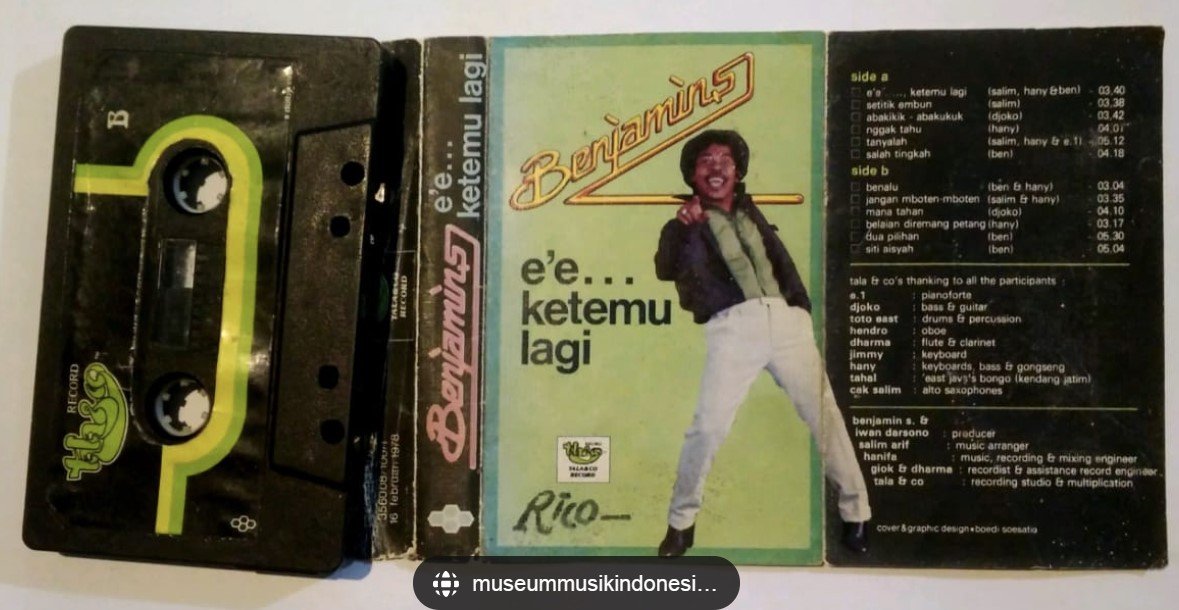 Benjamin Sueb, a.k.a. Benyamin S, Bang Ben, or Babe (March 5, 1939-Sept 5, 1995) was a prolific Indonesian comedian, singer/rapper, radio producer, director and actor who produced 61 films and 312 songs, which included 165 singles and 147 duets. He also produced 5 comedy albums, 2 soundtracks, and 10 compilations. Sueb was of Betawi descent. The Betawi are Islamic native peoples from Indonesia who are from mixed race marriages and blood lineages, including Chinese, Arab, Portuguese and Dutch colonies, from various tribes in Jakarta. Sueb was the youngest of eight siblings, born to parents Siti Aisyah and Sueb in the Utan Panjang Kemayoran village. Unfortunately due to poverty, the Sueb-Aisyah siblings lost their father when Benjamin was two years old, and he took it upon himself to be an entrepreneur at the age of three, busking in his village to pay school fees and buy/barter food to help feed his family. Entertaining may have come naturally to Sueb, being influenced by grandfathers Saiti, who played clarinet, and Haji, an Ung Dulmuluk player who performed at Indonesian folk theaters in Dutch colonial times (Wiki).